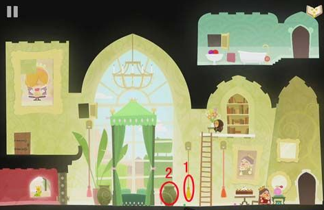 2、第二步看到小丑走了以后我们就出来把①地点的绳子拉下再躲进②地点的花瓶中,此时会再过来一个厨师端着蛋糕走进里面,然后他会踩到地上的珠子,将蛋糕全部丢在了王后脸上;厨师就会跑掉,女王也会出去,这时会进来一个士兵。(如下图)