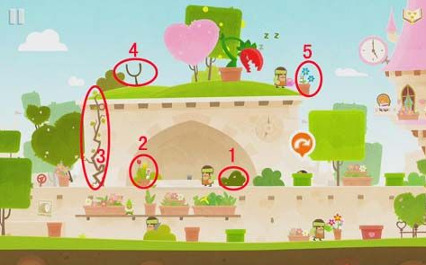 2、当左边的园丁要去修剪鲜花是躲进①出的草丛中,当园丁到右边修剪草丛就出来到②处拿第一束鲜花,然后迅速的到③处爬上树藤到④处把绳子绑上,然后用小鸟弹食人花,食人花就会把⑤处的园丁给吃了,我们接着就可以到⑤处拿第二束鲜花。(如下图)