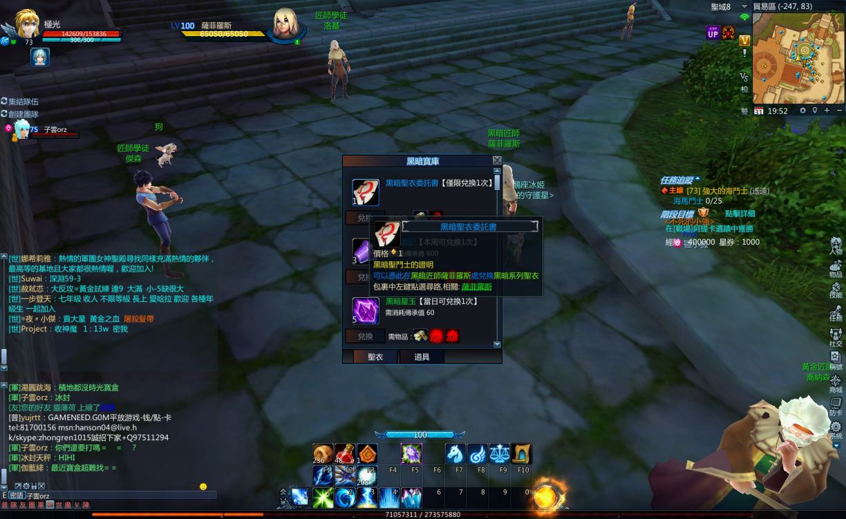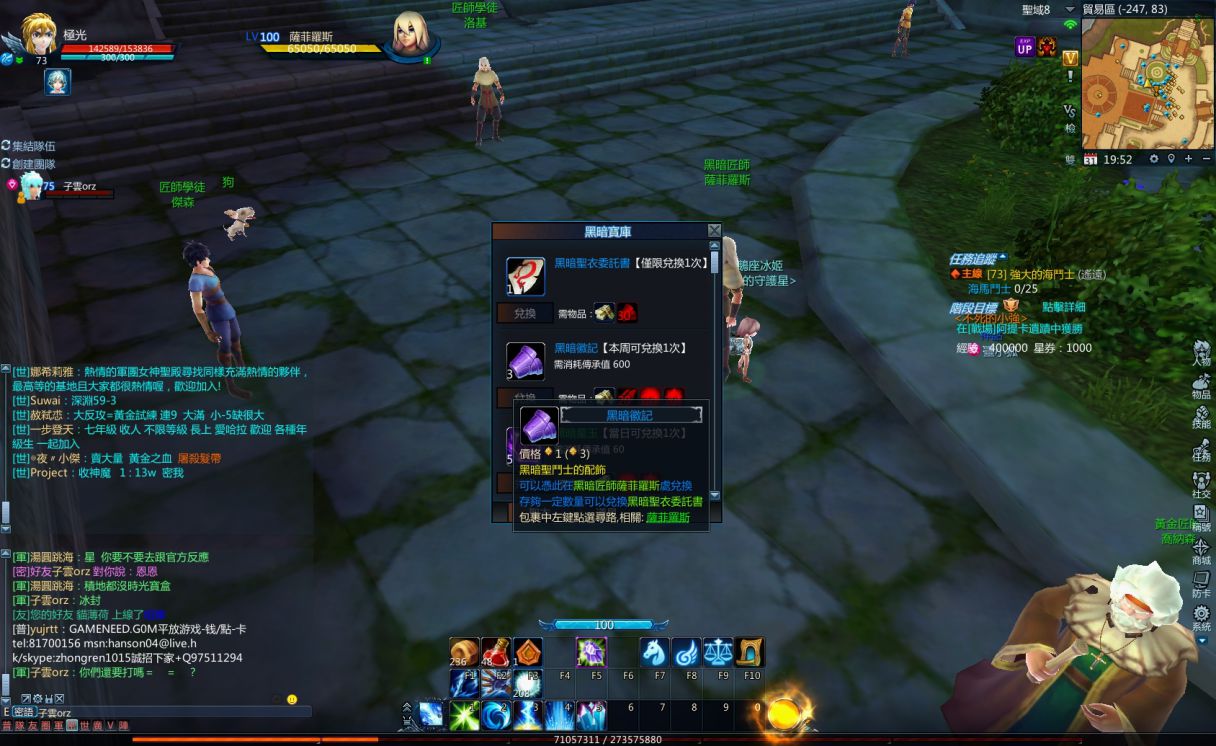 第一: 你必须60等以上 ,可以取得(传承值) 60等以上开团 ,59等以下最少要3位, 取得传承值方法有 (风爆)进阶版(深渊)~(沙织) 进阶版(女神近卫队)~(12宫危机) 进阶版 (重生)~(黄金试炼)进阶版(大反攻)。目前 ,小弟知道的就这几个活动! 正题来了!取得黑暗圣衣需要 (黑暗圣衣委託书) ,取得方法是需要30个(黑暗徽记) 那怎麼取得 ,请先看交换的NPC。