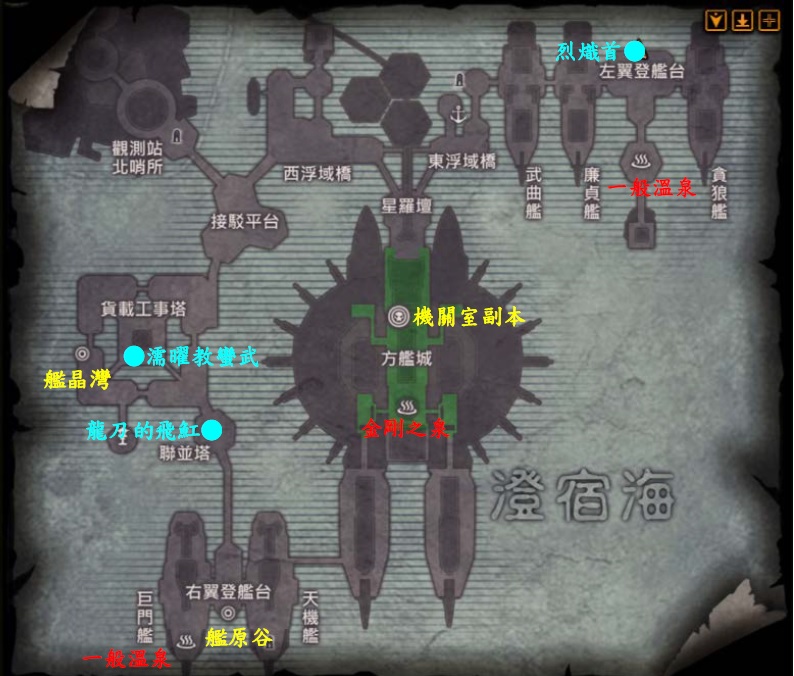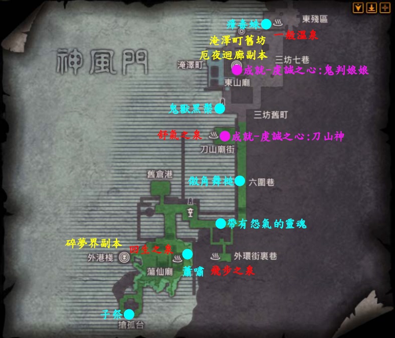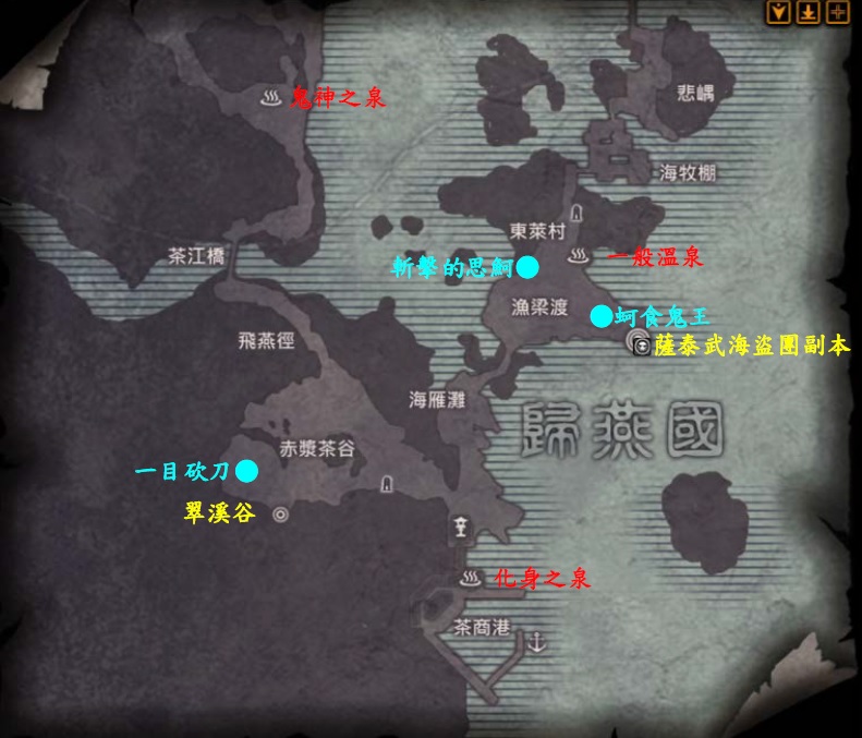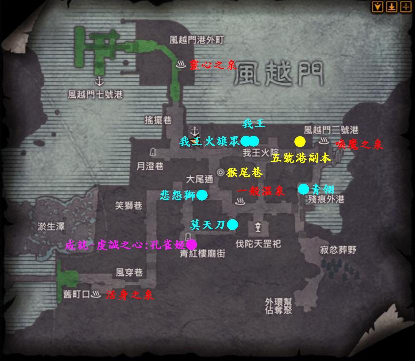 | 地图名称 | NPC | 怪物 | 温泉/副本/其他 |
