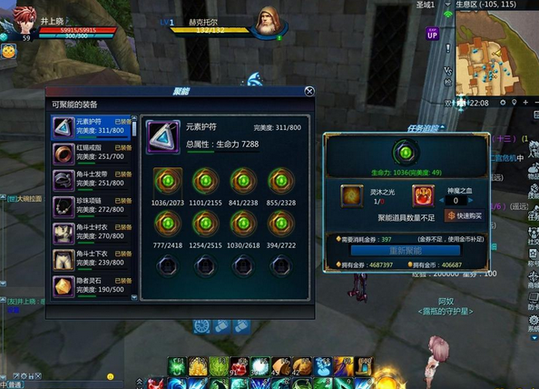 玩家可以在任何城镇中对你的人物装备进行聚能,聚能一般的装备需要消耗『灵沐之光』,每次聚能的能量在1%~100% 中随机变化…聚能量愈高、机率愈低,一般很少超过50% ,10~20% 的机率最大,使用『神魔之血』可以提高聚能效果的最低能量… ( 以上二样物品在任务及副本、活动中皆可获得) 。