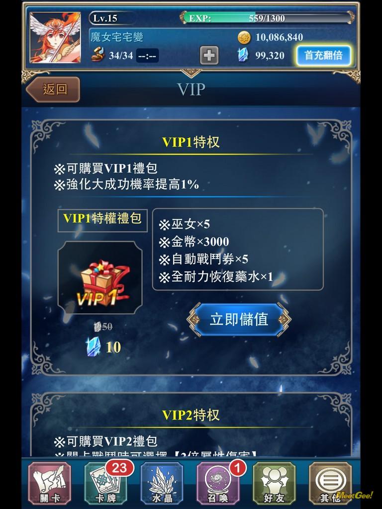 ▲在「魔女大战」中,设计有所谓的「VIP 」特权等级,总计有多达12 种不同等级的VIP ,可以获得的好处也各有不同。