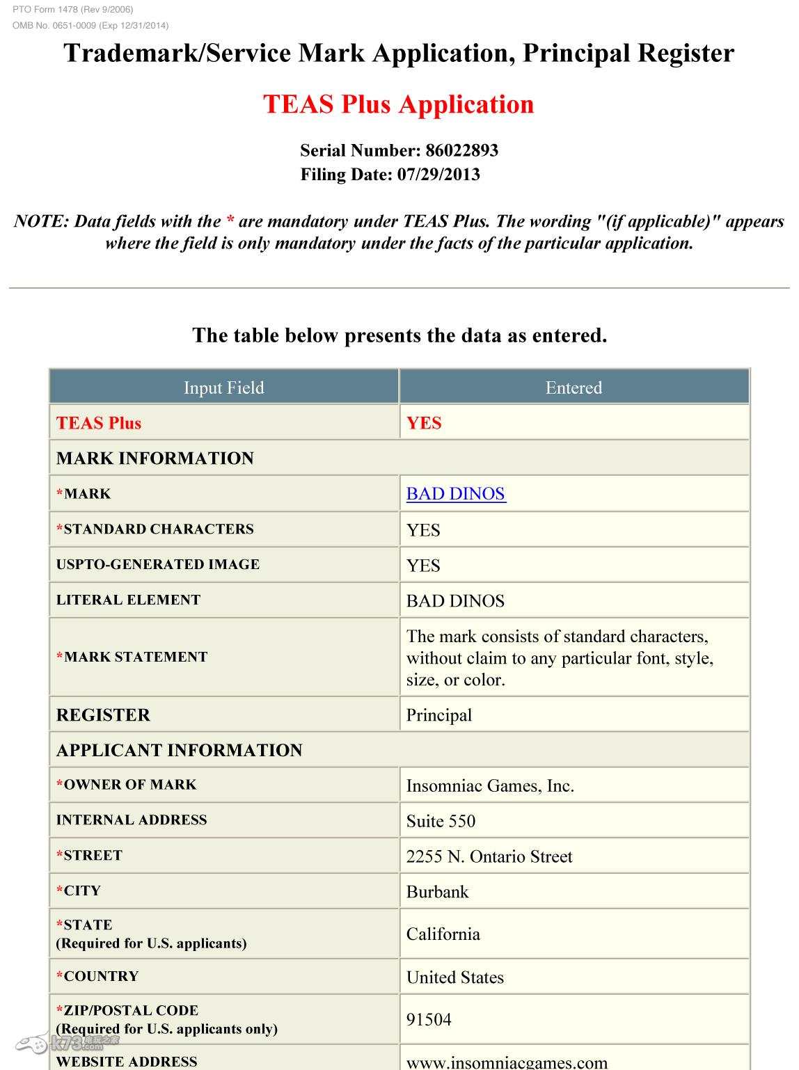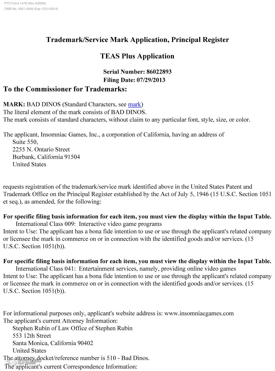 以下是Insomniac Games工作室官方注册“Bad Dinos”商标的一系列信息: