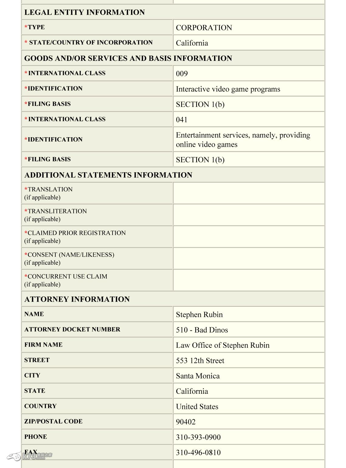 这个商标是2013年7月29日注册的,商标的使用中将会包含人物等内容,由此可见这个商标极有可能是用来制作游戏!那么这款《Bad Dinos》又将是怎样的一款游戏呢?请留意我们k73后续报道。