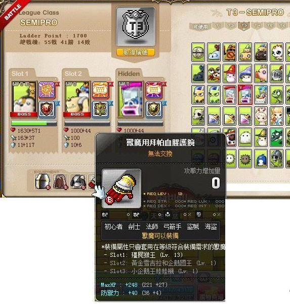 兽魔的装备虽然可以不看等级直接穿上去,但是兽魔等级没有到达装备标准的话就不会套用能力。令人伤脑筋的是兽魔装备都是绑定不可交易的,一旦玩家打到20~30等的装备就得要升级到T5以上(T1兽魔最高等级10,每升级一次最高等级+3) ,不然这些装备就会长期占据身上的格子。建议有要投入精力练兽魔的玩家从低等怪开始慢慢打。