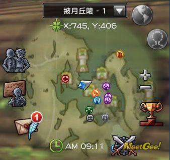 显示角色的所在处。右上按钮可观看区域地图,右方缩放按钮则可调整地图大小,左上按钮可以开启好友名单,左方按纽为寻求组队,组队按钮下方为信件提示、右下方则是排行榜与竞技场按钮。地图上可显示队友位置及任务回报位置。 |