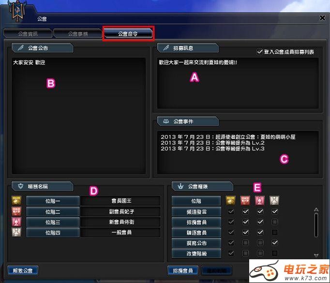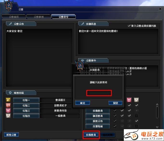 可设定公会内各职务名称并设定各职务权限,也可编辑公会公告与招募讯息。