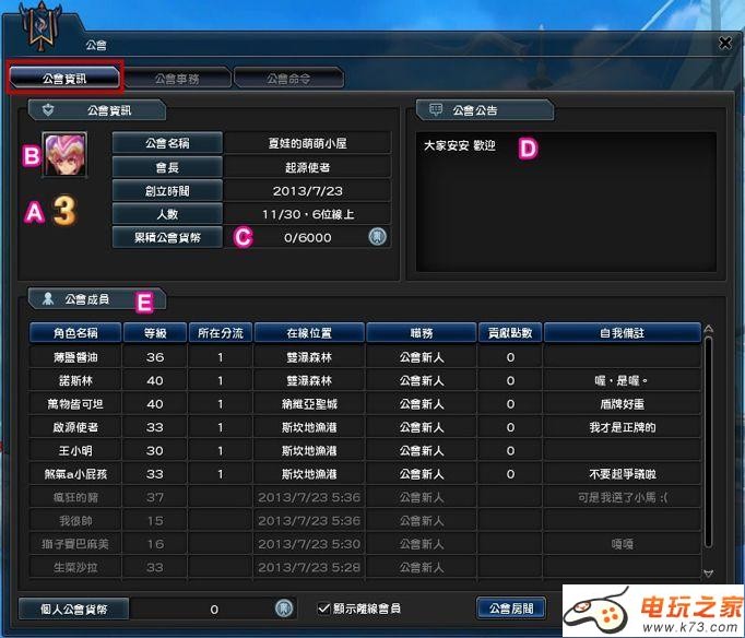 ◆ E. 公会成员名单:会显示公会内所有成员的名单,可用显示离线成员来切换检视状态。