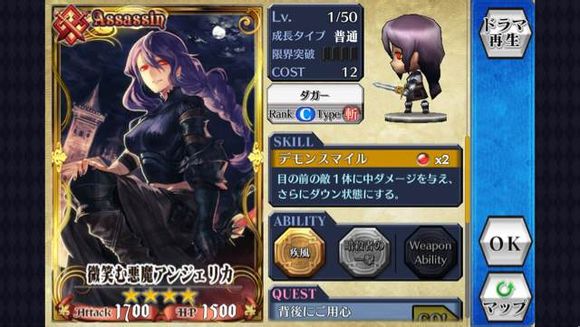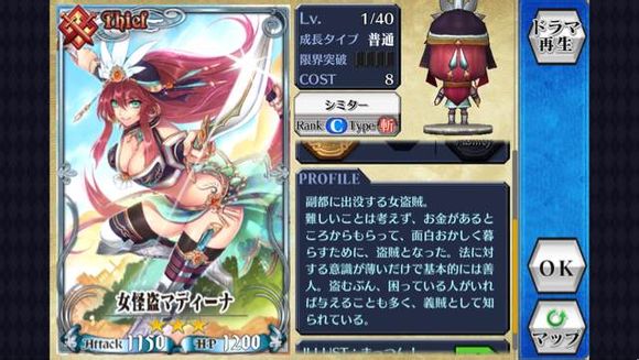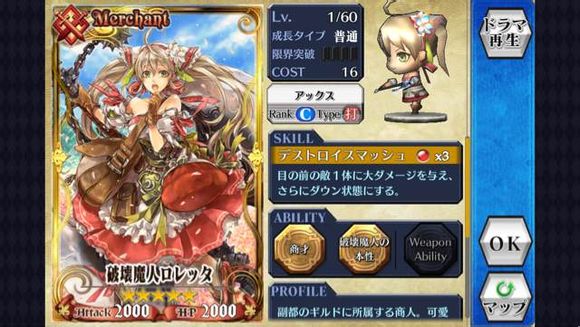 首先,当然是我们喜闻乐见的破坏魔人,而他的职阶是MEREHANT(商人),这类职阶的卡片最大的特点就是,所有的卡片都带了商才(或者大商才),类似赏金猎人的感觉?总之,这类卡片自然是缺钱人士的首选。