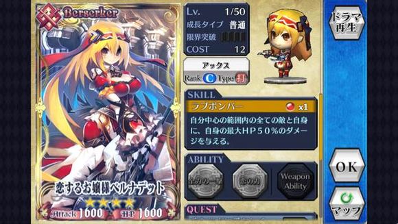下面就是我们大小姐了,我开头一直想不明白,为啥大小姐的大是自爆。。那么萌的妹子说,后来一看她职阶,明白了,人家可是BERSERKER(狂战士)啊!!!这个职阶的卡片的天赋和能力,都是将攻击成长放在最高的,所以经常有人说这个小妹妹还厉害,比同级的ssr输出还强力。但是反过来,生存能力较差,大招几乎都是属于杀敌一千自损八百型,推荐该类职阶用做副攻手。