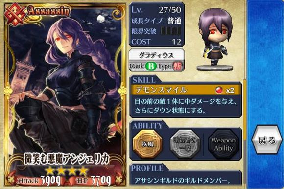 这张刺客也是人气很高的不用我多说。至今都打到湖都了还没有遇到其他在我心目中可以取代她位置的战士。二城有张鬼族的妹子也不错吧。不过那个觉醒任务麻烦。不过我自己是不把战士放卡组里的,一般都是借,一般就借这张刺客了。