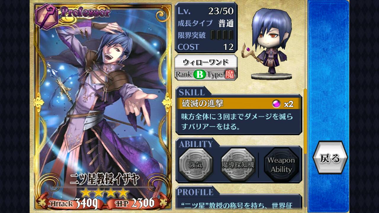 继エレミア后,イザヤ是贤者之塔的另一亮点,除了拥有近似强运の戦士ニンファ的打宝技能外,强気的实用性很高,可增加作为后卫的イザヤ的攻击输出。主动技破灭の进撃是很稀有的技能,能于混战中减低伤亡率,可谓是脆弱的纯魔法师队伍的关键。