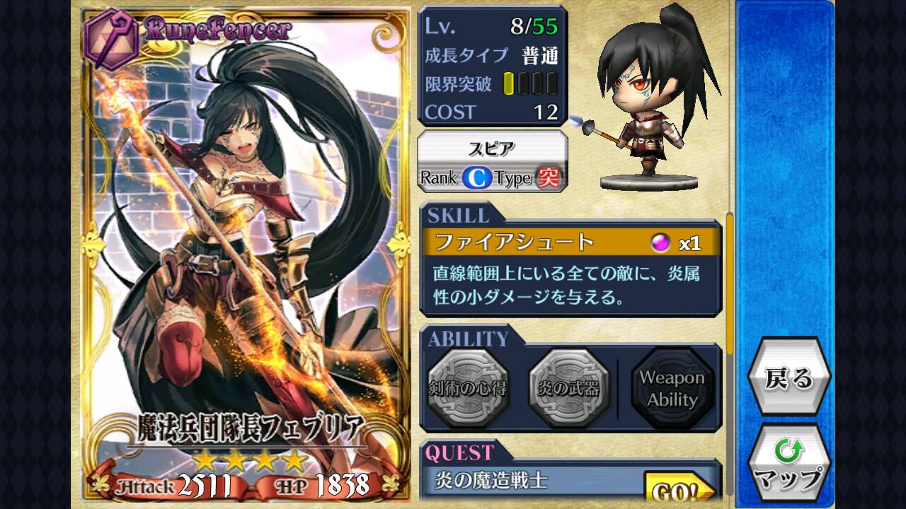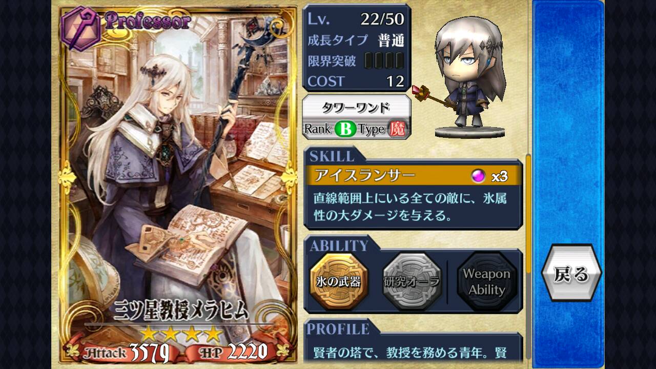 氷属性魔法师的一员,可以说是魔法兵団队长フェブリア的氷属性版本,但アイスランサー须要3MANA,消费比3位SSR还要高,而且是直线範围攻击,效果一般。而另一技能,研究オーラ,对魔法师而言实用性不大,毕竟很多时只有前线队员才有机会中毒。而暗闇状态,只要稍为注意或有前锋紧贴敌人白兵应该不是问题吧?