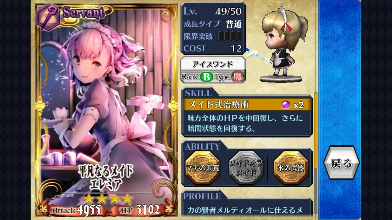 说不定比起SSR,会有更多人想要这张女僕,暂时唯一拥有回血技能的SR魔法师,而且回復效果不错,没有她,纯魔法师队就不可能成立,就算在杂色队,因为可以除了Healer外多一次回復机会,安定感不错。被动技マナの素养是很少魔法师拥有的良好技能,更确保到エレミア可以在任何队伍中都有足够MANA使用到回復技能!