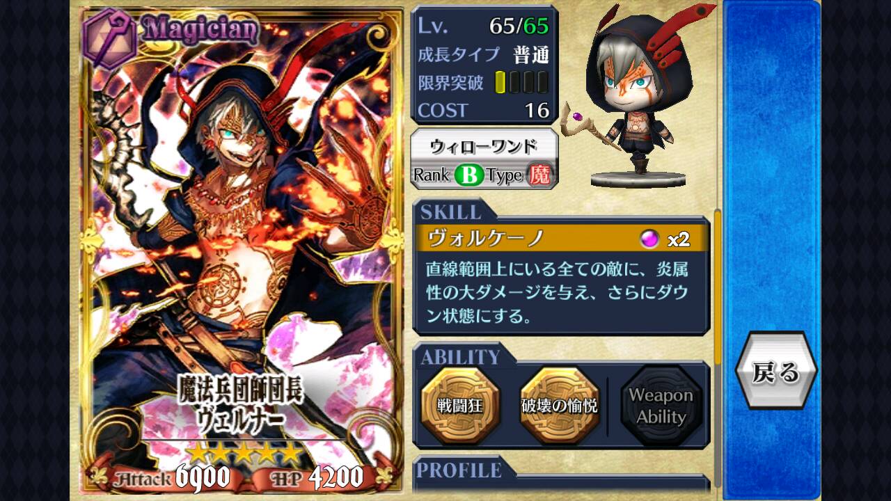 最高攻击力的火魔法师,两招被动技都是增加攻击力,令他成为游戏中数一数二的攻击输出者。ヴォルケーノ是典型魔法师的直线範围攻击,由于附有击倒(Down)效果,泛用性不错。但问题是最重要的破壊の愉悦需要Lv65才学会,也就是要限界突破1次,所以有很多玩家表示ヴェルナー不突破就用不下去...
