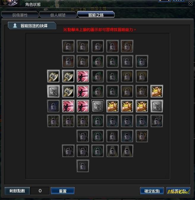 这也是一个相当特殊的类型,这个路线跟副修火炮一样兼具近战跟远程的攻击组合。如前面特点所说的,这是一个很阿莎力的路线,尤其是搭配全爆击,爆来爆去的更加有爽感。这是一个以PVP 为主轴的点数配置。剑盾本身好用的技能的确不少,有走位技、有减伤技、有反弹技、有昏