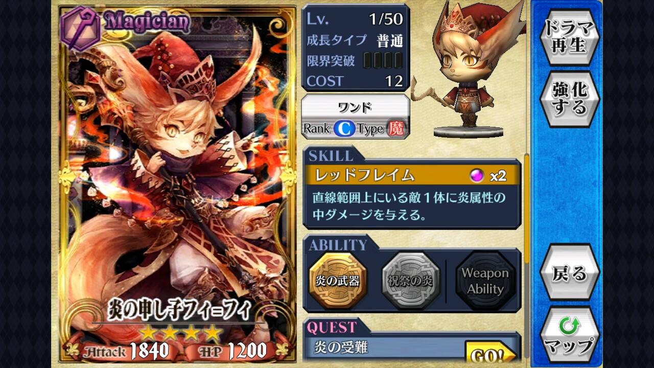炎属性魔法师队伍的攻击输出要员,没有什么特别的技能。只是单纯必杀技攻击力很高,算是魔法兵団师団长ヴェルナー的下位互换。ヴェルナー的代替品?不可能啦。