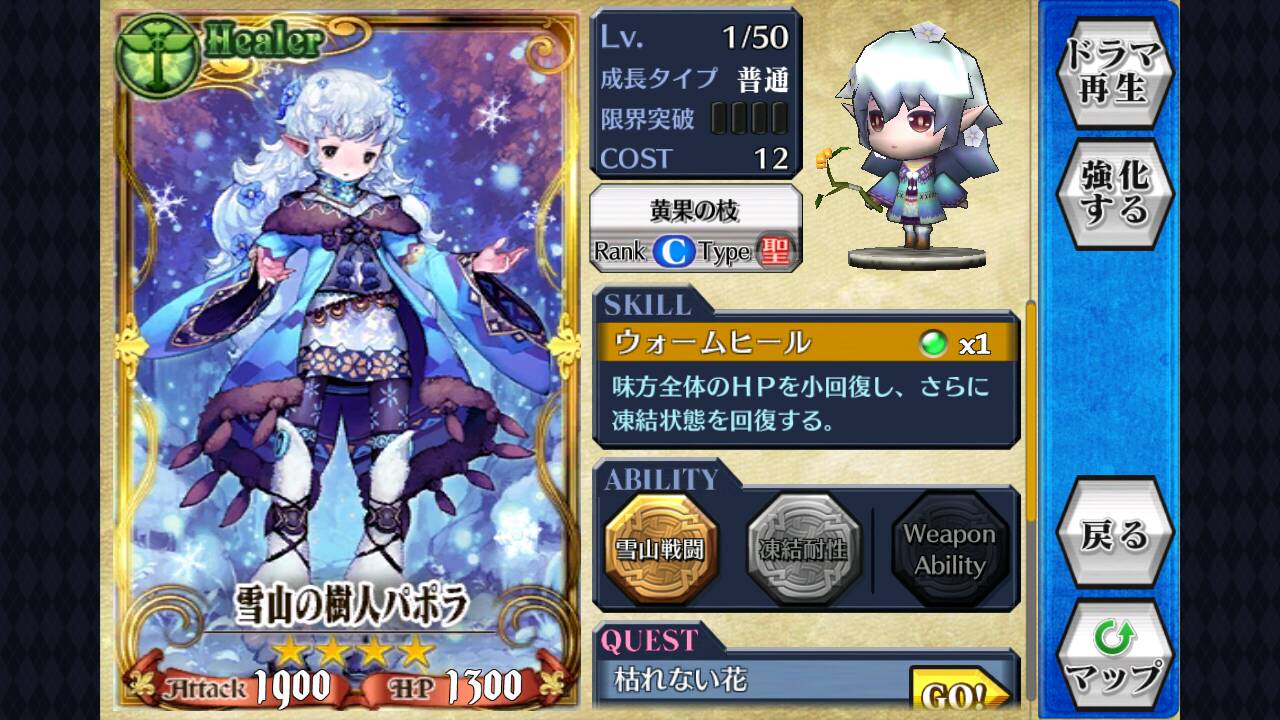 评为下位Healer,但攻击力奇高(Lv1 1900)的僧侣,被动技能「雪山戦闘」令她进行雪地战时可当攻击一员。由于回復量是按攻击力计算,雪地使她攻击力进一步上升,治疗时并不一亚于别的僧侣,相较之下,パポラ明显是属战斗向,配上防御Bonus很高的武器,甚至可为前线?