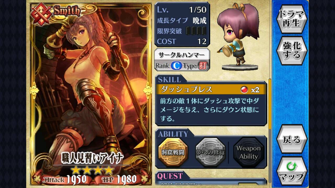 为了练功而生的SR,ダッシュプレス效果只能算合格。2招被动技令アイナ在洞窟以外的地方等于没有任何技能而且成长类别是晚成,练功以外的时间实在派不上用场...最遗憾的是Ability 梦への修行 的觉醒条件是50级。有爱!有爱!有爱就有育成理由!