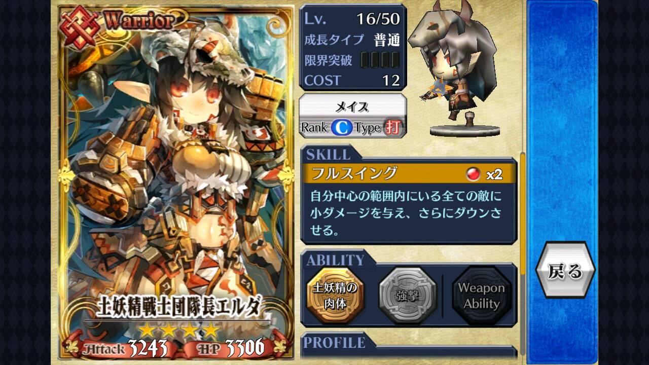 活跃于混战的战士,主要效用就是击倒(DOWN)敌人。フルスイング除了是範围击倒众多敌人外,同时亦是战士少有的範围攻击,这对以战士为主的队伍非常重要,Ability强撃虽只有5%,但由于战士攻速快,效果出奇地好。而击倒(DOWN)效果可打断敌人的必杀技,面对强劲的Boss时会出现意想不到的效果。跟ヨルデ一样拥有土妖精の肉体,再配合强撃,变相是增加击倒(DOWN)敌人的机会。