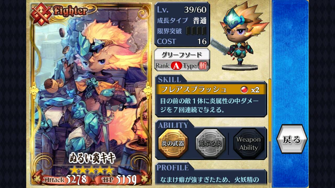 优秀的战士,拥有高攻击输出的对BOSS必杀技,而且只耗2MANA。荒ぶる炎令到キキ愈战愈勇,不过颇难调整HP至1/4以下,要活用的话有一定技巧及风险。另外,由于是火属性攻击的关係,在接下来的湖都有点派不上用场。(不过精灵岛那边有敌人怕火啊!)