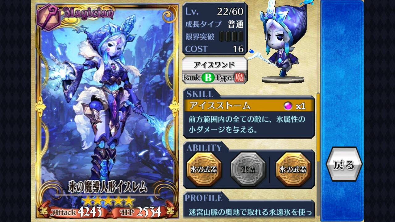 相比起之前贤者之塔的魔法师,作为SSR的イスレム人气一般。アイスストーム跟其他普通魔法师的技能没什么大分别,1Mana 的发动条件不过不失。比较稀有的是可以令敌人陷入冻结状态的Ability冻结,敌人不能移动及攻击,且于冻结状态下受到伤害大幅提升,效果看似极佳。可惜是机率只有10%,冻结的持续时间极短,而且不是範围效果,没想像中实用。