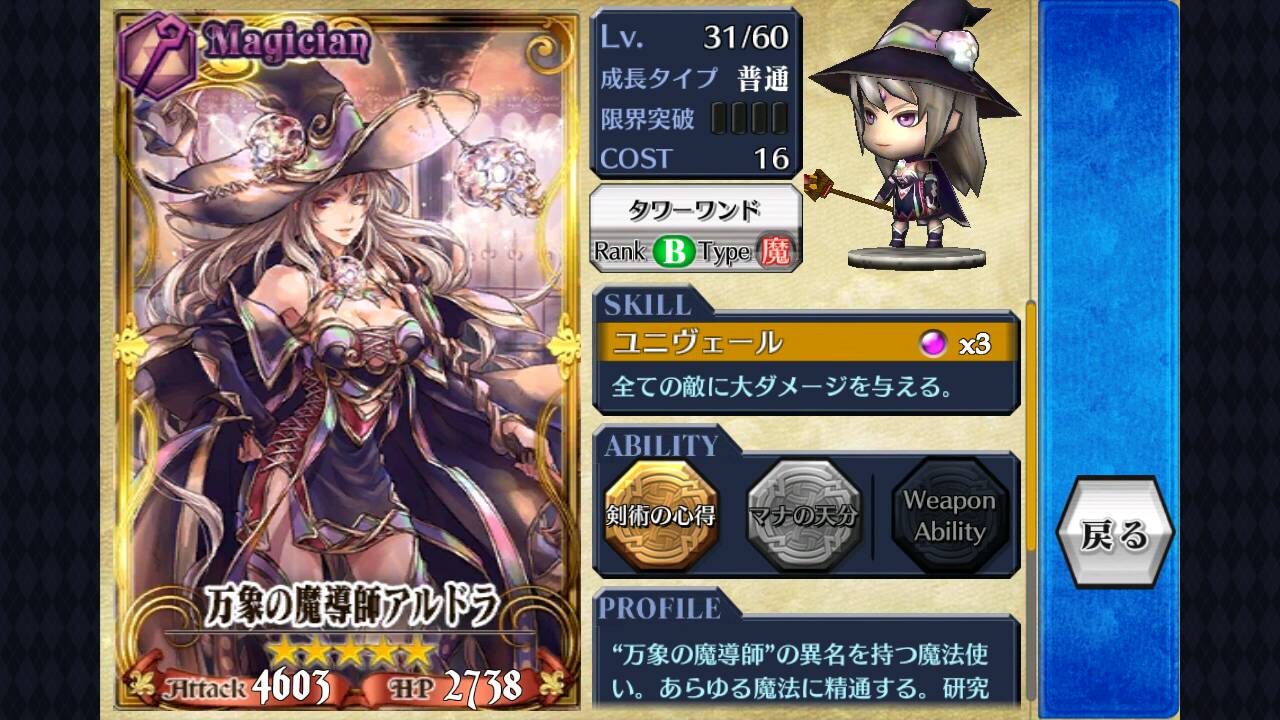 二ツ星教授イザヤ负责在有需要时放减伤屏障(例如当太多敌人冲到前线) ,施放减伤屏障后,队员轮流当肉盾。平凡なるメイドエレミア当然是在队伍遭重创时进行回复急救。 可能大家有疑问,有足够Mana施放这么多技能吗? 由于アルドラ的マナの天分和エレミア的マナの素养, 战斗开始时已经有5点Mana,(是平日须要2-3Waves累积的量) 再加上是纯色队伍的关系,之后所抽到的Mana会全是魔法师Mana 实际使用方法。