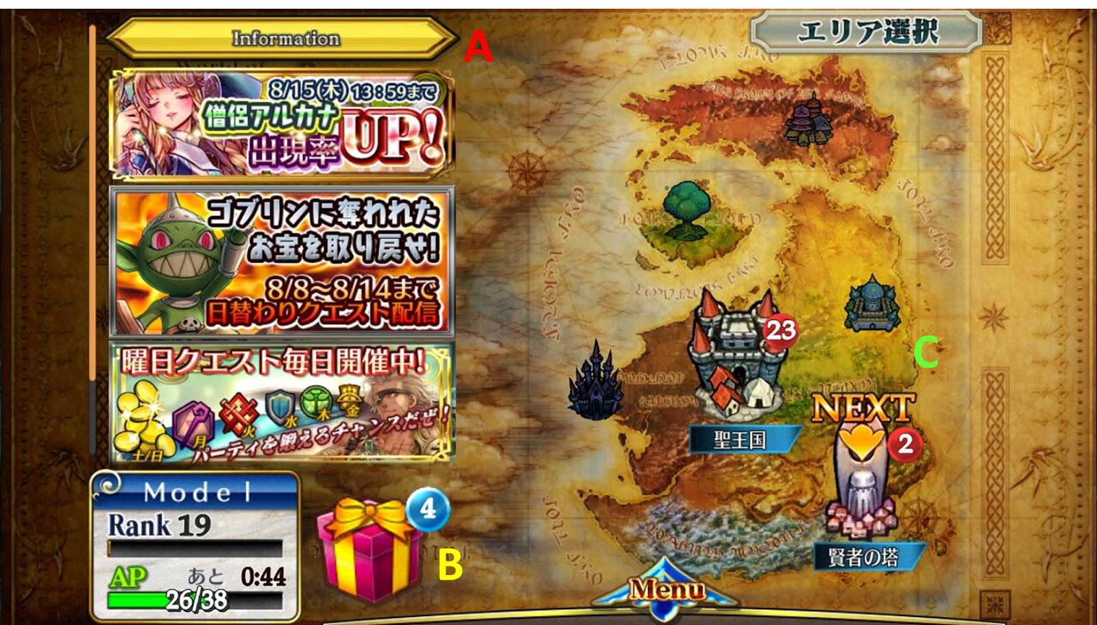 F -常用介面,左起分别是组队编成,合成,扭蛋,朋友,商店及系统Menu。 进入城市后,玩家可以进行不同类型的任务。包括主线任务、自由任务、角色(们)独有的支线任务,曜日任务,以及Event期间限定任务。每个任务攻略后,均有机会获得完成奖励。暂时获得任务完成奖励的方式有二种。一是如图中红色Main3-9 Quest可见,进行3次任务后,获得精灵石一颗。另一种运气成分较高,是收集Quest中的4个宝箱,才能获得礼品。而角色任务则于游戏担当着举足轻重的地位,「觉醒」奖励能够使角色习得新的Ability,大大角色实用性。