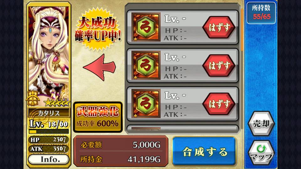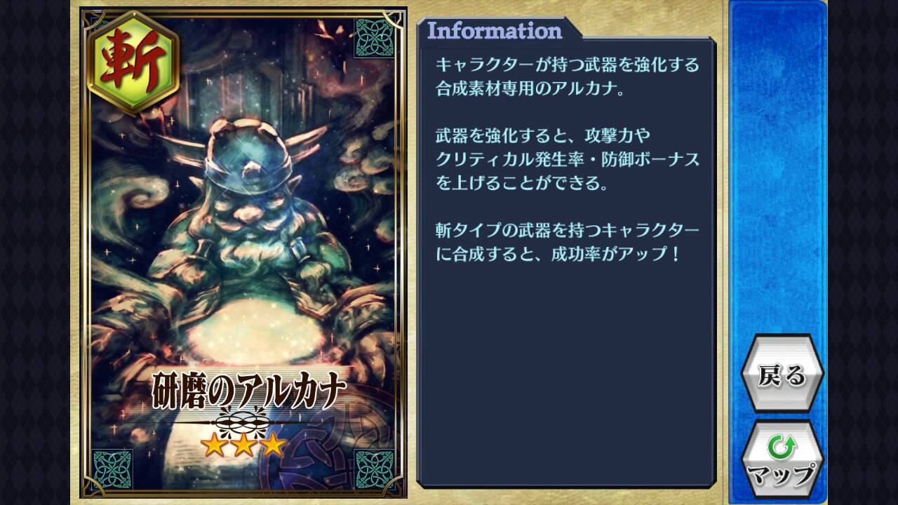 塬本的加值在不超过新武器的加值前提下,会予以保留。最后,建议先将武器强化素材储存至10张才使用,一来节省金钱,二来能以较少的素材卡获得较多的强化点数。而每到关键位置前(如加成点数合共10,20,30)亦应一次合成10张锻冶卡。