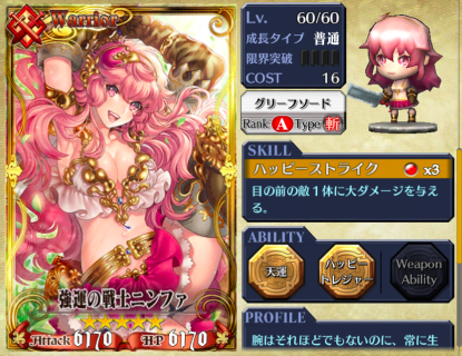 由于要开齐四种宝箱才拿到最后的完成报酬,运气差的话有时连打10场也开不齐,很浪费AP。但有强运战士的「Happy Treasure」增加宝箱出现率30%的话,要集齐就明显简单得多,如果自己抽不到,就赶快找个好友吧!