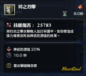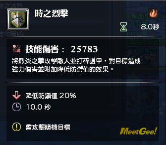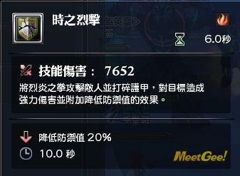 洛克萨算是一个比较好打的BOSS ,不过BOSS 所施展的前两招玩家都需要好好防范。时之烈击是特定小圆形范围攻击,伤害虽然不高,但附带降低20 %防御,如果没闪过,情况是会相当危险的。时之冰结则是放射性线型范围攻击,洛克萨会往周遭6 个方向施放时之冰结,被扫到的后果就是血量只剩一半左右附带被震飞状态。