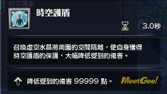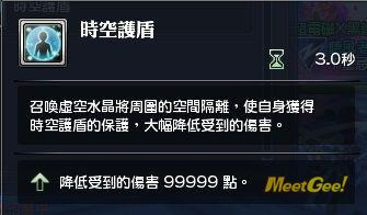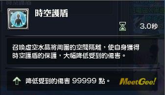 时空护盾这招则是会召唤虚空水晶,玩家看到虚空水晶得要优先打掉,要不然在减伤99999 点的作用下,玩家是打不到BOSS一跟寒毛的。整体来说,只要虚空水晶有优先打掉,时之冰结这招大部分都有闪过的情况下,打倒这个BOSS 是相当容易的。