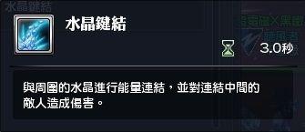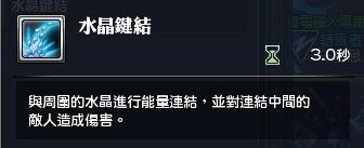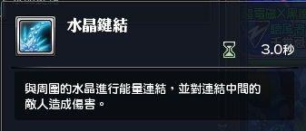 水晶键结是没有红色框预警的范围攻击。水晶键结的攻击路线是看霍尔斯‧圣角跟旁边八个璀璨冰柱的位置而定。BOSS 会朝着这八个璀璨冰柱发射水晶键结,若玩家站的位置是BOSS 跟八个璀璨冰柱连结点的中间就会被扫到了。而这八个璀璨冰柱虽然是可以被破坏的,但由于冰柱回血的速度也挺快的,因此笔者认为还是直接打BOSS 会比较伐算。