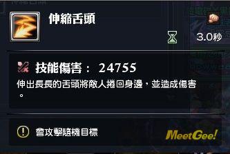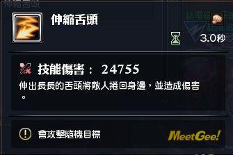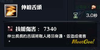 蜥蜴王会使用伸缩舌头此招把玩家拉到蜥蜴王的身边,并造成伤害。被拉过去的玩家如果又被蜥蜴王施展尖啸衝击此招无预警地衝刺到玩家的身边来给予重伤害,结局很有可能是会当场惨死的。不过整体来说,这个BOSS的攻势并不致于会让玩家灭团,但如果运气衰的玩家被蜥蜴王一撞一拉,可是会一命呜唿的。