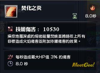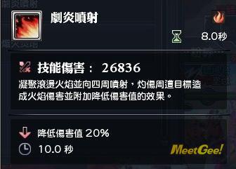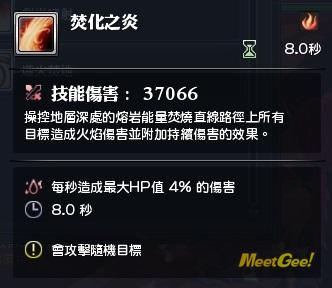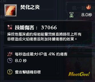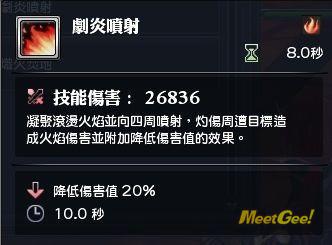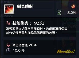 接下来,55级的两种副本,最难打的BOSS大概就是这一隻了。塔兰德‧尸翼的叁种攻势都是恐怖的範围攻击。焚化之炎是直线型攻击範围,除了伤害高,附加的每秒扣血4%更是让人难以挽救。剧炎喷射虽然杀伤力没那么大,但附加降低伤害值的效果将让玩家的火力降低20%。而且,对于玩家来说,更加棘手的是,由于场地上的颜色也是火红色的,因此这使得BOSS的攻势範围更加的难以让玩家辨识,玩家如果没看到或反应没过来,大概就準备血量见底了。