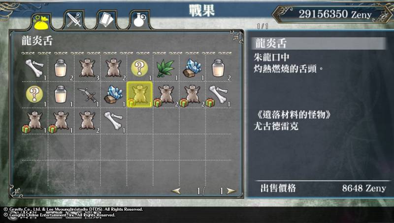 素材掉落:[角破坏:緑龍之蜴角]、[翅膀破坏:緑龍之翼膜]、緑龍之柔鱗、緑龍的泪、龍蜴齿