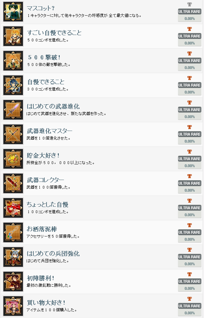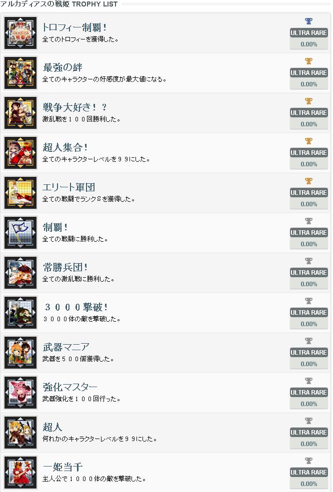 《幻想国战姬》的正式发售时间已经接近了,就在2013年9月26日,这款作品是日本一创社的20周年纪念作品中之一,所以玩家如果体验过还是可以从游戏中体验到一丝良心的。这款作品和其他的普通游戏都差不多,都是通过战斗胜利获得经验并达到升级的目的,而在升级以后就可以学习到更多的技能在战斗中得以使用。对于游戏中的一些新的战斗系统和新BOSS等,小编这里就不剧透了,玩家们就得自己去玩去体会了,奖杯一览送给大家