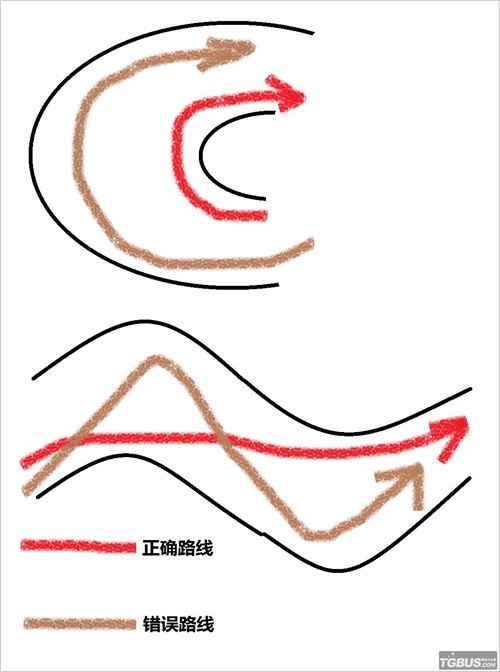 过弯道尽量走小圈,缩短路径。S型弯道优先走直线,如下图所示。红色是正确路线。