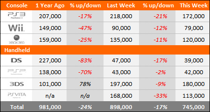 与上一年同期相比,几乎全平台销量下降,除了3DS之外。PlayStation 3下降了35,000(-17%)台,Wii下降70,000(-47%)台,Xbox 360是下降39,000(-25%)台。PSP下降97000(-70%)台,而DS则下降了188000(-83%)台。将本周的DS和3DS结合, 仅比去年的DS销量低8000台。而VITA和PSP销量相结合,与一年前的PSP相比则增多了17000台。与去年同期相比,今年的销量下降了 236,000(-24%)。
