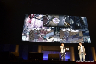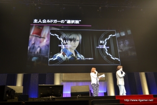在会场中,也实际展示了游戏画面的影片,并举例介绍。内容為事件(イベント)发生时会出现选择项目(选択肢),玩家可使用 R1 或是 L1 按钮来切换选择这两个选项。经由所选择的选择项目内容,将会大大影响游戏剧情之后的走向。但是,这似乎并不表示其中会有一个选择一定為正确解答。「经由选择来影响事件的展开(=未来)将会随之变化,和现实生活一样的正确答案并不是只有一个,『哪一个都是正确答案』的状况也是会发生的」,马场先生如此说明。