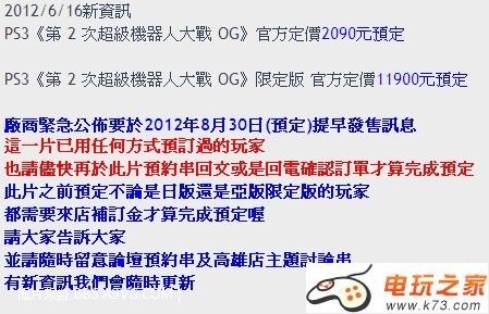 发际于NDS的作品超级机器人大战OG系列自搬上PS3平台后宣布游戏发售日期锁定今年冬季,不过貌似官方已经等不及了。日前,台湾德周电玩论坛爆料,本作将提前至8月30日发售,后续情报请留意本站报道。