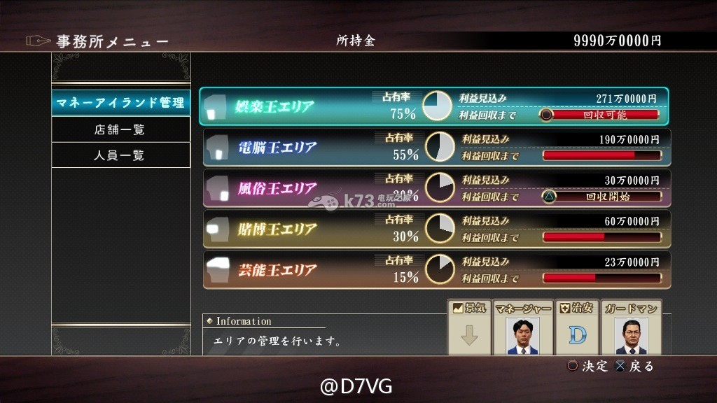 神室町金钱乐园的专用选单画面。可个别进行五个区域的攻略。