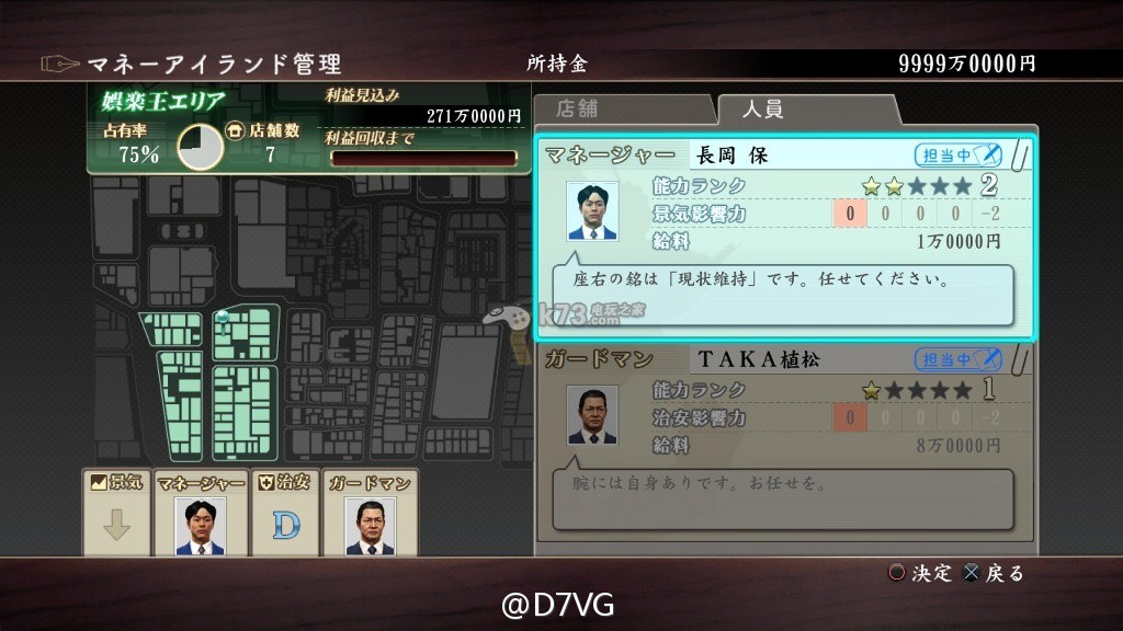 在神室町裡所必需获得的不仅仅只有金钱而已。藉由确保优秀的「人才」,来赚取高额的收益。在金钱乐园裡存在着「经纪人(マネージャー)」「保安(ガードマン)」「顾问(アドバイザー)」等三种职业的人才,可藉由击倒宿敌或是经由通过支线剧情来持续增加。在街道上彻底来回寻找,广招最强的伙伴加入,奠定作为根基的经营阵容。