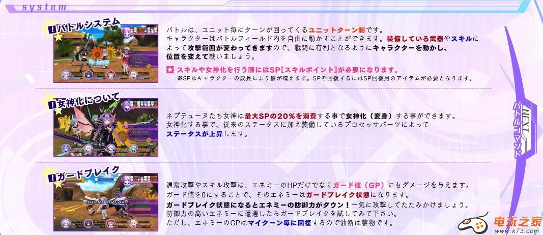 ネプテューヌ女神们能消耗最大SP的20%以女神化(变身)。由于女神化,地位会根据原有的地位再加上装备的处理器零件而提高。