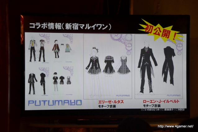 而与新宿 O1O1(新宿マルイワン)的服装合作企划将在 11 月 1 日到 11 月 15 日举行的活动虽然有在「时空幻境祭典 2012」中发表过了,不过这次由所参加的品牌 PUTUMAYO 首次公开爱丽洁(エリーゼ)版跟罗严(ローエン)版的设计样式。