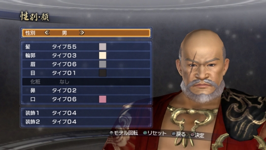 脸部除了轮廓,眉毛,眼睛,鼻子,嘴巴的详细设定之外,还可以加上两种装饰,女性武将则可以选择要不要化妆,除了可以选择内建类型来简单制作之外,各部位的尺寸跟位置还有角度等都可以做细部的调整。