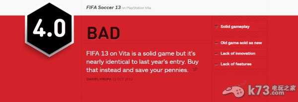 日前,IGN网站公布了其对于近日发售的FIFA全新作《FIFA13》的游戏具体评分,本作以其超没有诚意的制作和毫无进化的游戏画面和游戏方式而获得了4.0分的超低评分!