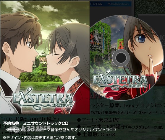 《Exstetra/エクステトラ》游戏的预约特典包括游戏的迷你原声音乐CD和由下村阳子亲手制作的主题音乐CD。