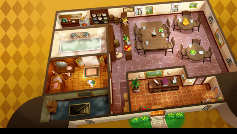 在这些一楼的设施中,玩家们可以利用大厅的留言板来接取各种任务,这些任务包括有恶魔之钥入手时必须完成的关键任务,在任务名称的前面会有钥匙的图案表示),以及玩家们在故事进行时所会触发的各种其他支线任务等两种类型。至于地下室,则是可以让玩家们从仓库中领取道具或寄放道具,或是使用魔力榨取机来榨出隐藏在武器防剧中的魔力之源来进行武器防具的强化等等(抽出的魔力值最多只能储存保留9,999而已,而武器的强化除了会消费魔力之外,还必须花费金钱(G)才行)。另外在地下室还有一名从事葬仪社的少女布萝梅丝,玩家们也可以透过她来让死亡的伙伴进行復活。至于玩家自己与伙伴的房间,则各自可以摆设一个家具作为装饰。由于家具可以强化居民的特性值,因此玩家们可以在道具屋购买需要的家具,或是利用迷宫入手的家具来提升伙伴的数值能力。