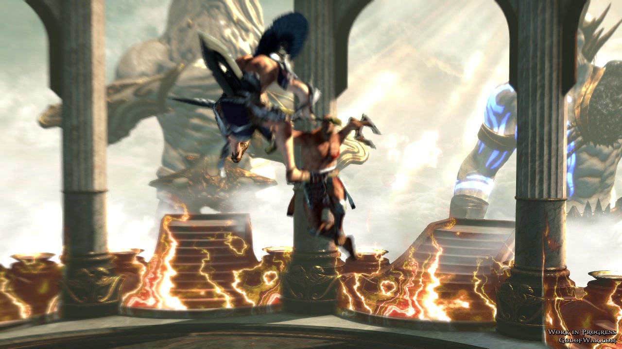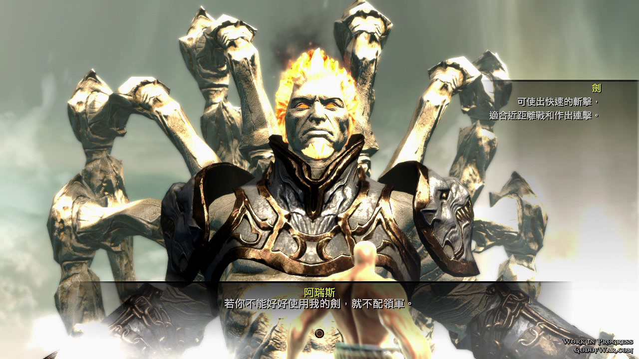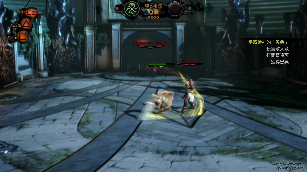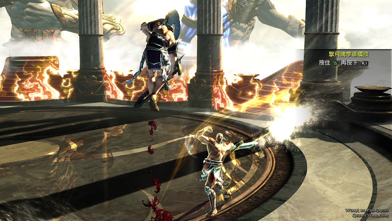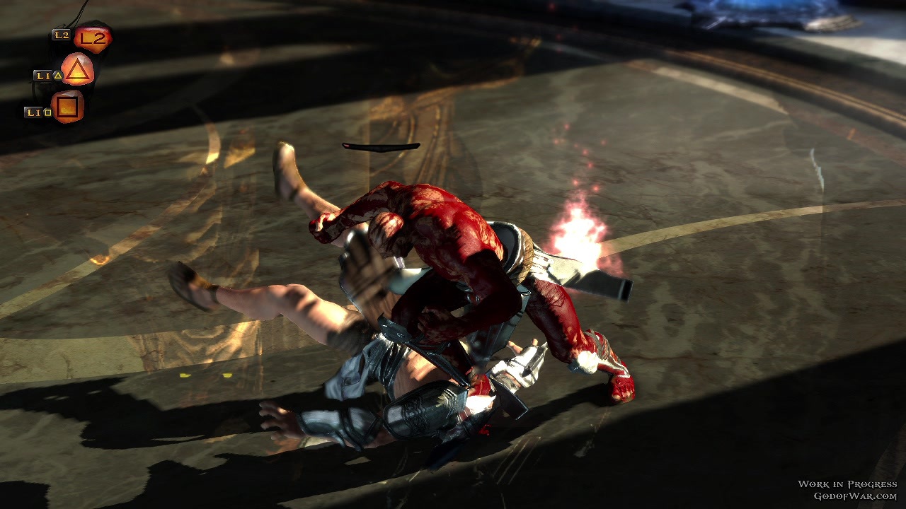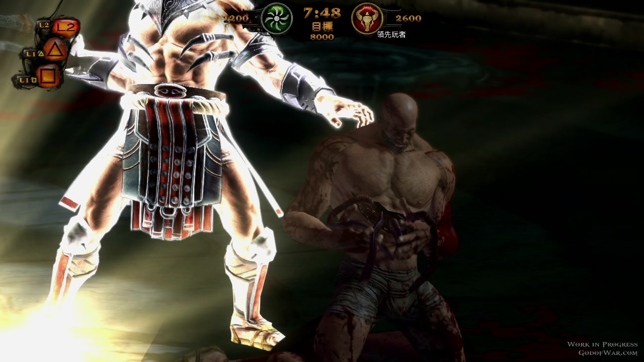 选择了所效忠的的神之后,系统会派给你一个对手(也是沙包),让玩家暖身小试身手。基本动作有拳脚攻击、反弹、反击、以及闪避等动作。进阶动作则可以将对手击飞、并且在空中,锁链扯回来接续爽快的连段攻击。而当对手的被打至产生红色光圈时,就如同克雷多斯一般,可以按下 R1 给予对手「痛快」的死亡。